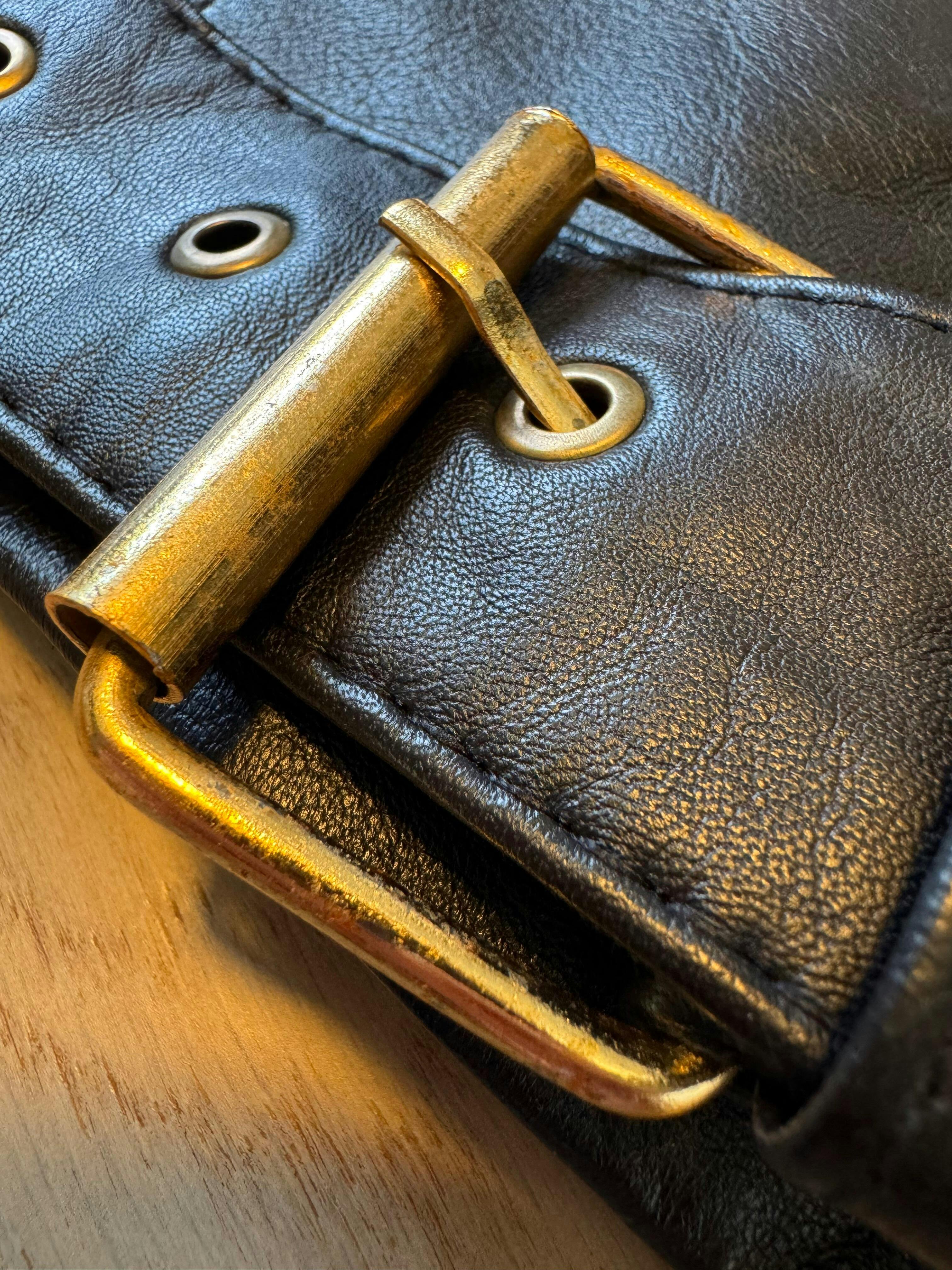 Biker style zipper module, quilted shoulders, stylish belt, shoulder epaulets, golden hardware and streamlined back.